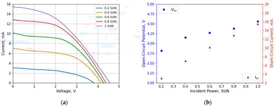 In Figure 2a, the I–V characteristics of the DSSC module vary according to the light intensity: in accordance with literature [], the curve shifts to higher current–voltage regions with an increasing SUN of intensity.
