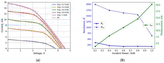 Fit of the I–V characteristics (a) and the incident power dependencies of Rs, Rsh, and Iph (b).