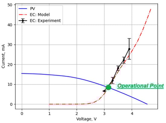The diode equation (Equation (3)), filled with the fitted parameters, was subsequently used as an electrical source within the COMSOL® simulation framework. This incorporation allowed the model to predict the operational conditions of the integrated PV–EC system under real-world scenarios. In the simulation, the PV module provided the necessary voltage and current for the electrochemical cell, enabling the evaluation of system performance at the intersection of the PV and EC module characteristics.