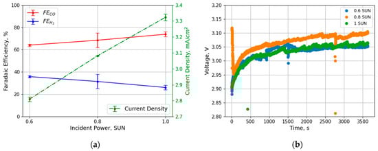 In Figure 5, the solar-driven electrochemical CO2 reduction is performed to produce CO through solar energy. Not only does the device show the correct operational point at 1 sun of illumination, but it is also possible to understand the performance under different conditions. At lower light intensities, in fact, the current density decreases rapidly (Figure 5a) along with the selectivity toward the CO2RR. Interestingly, the overall voltage (Figure 5b) does not change, ranging from 3.05 V up to 3.10 V when using 0.6 and 1 sun, respectively. This trend could be related to the proximity of the operational point with respect to the maximum power point of the solar cells, where the potential variation is small. As the device operates close to the MPP, the voltage remains nearly constant, even with changes in the light intensity, indicating that the PV module is effectively maintaining its voltage output within a narrow range.
