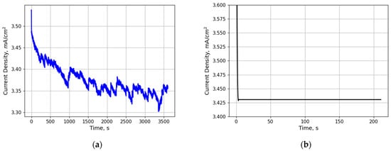 Experimental (a) and simulated (b) chronoamperometry of the PV–EC device under 1 SUN illumination.