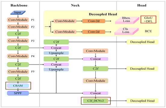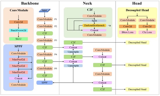 As an improved version of YOLO series, YOLOv8 mainly consists of three essential components, namely, the backbone, neck and head. The backbone part employs a series of convolution and transposed-convolution layers for feature extraction, while residual connections and bottleneck structures are introduced to optimize the network architecture, reduce the model size and improve the feature extraction performance. The neck part adopts the technique of multi-scale feature fusion, which fuses feature maps from different stages of Backbone to effectively improve the detection accuracy of the model for targets in different scales and complex scenes. The head part uses a decoupled head to accomplish the detection and classification tasks through two parallel branches, which not only improves the computational efficiency of the model, but also enables more accurate target location and classification, thus significantly improving the overall detection performance. The overall network structure of YOLOv8n is shown in Figure 1.