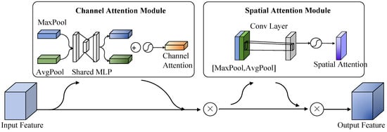 In order to improve the accuracy and robustness of pavement disease detection, this paper instantiates the feature attention module by CBAM [37], which can partly overcome the limitations of traditional CNN in dealing with objects with different scales, shapes, and orientations, and enable the model to focus on the crucial features of pavement diseases by simultaneously enhancing the channel and spatial attentions of the feature maps without significantly increasing the computational complexity, thus improving the overall performance of the model. As shown in Figure 5, CBAM consists of two key modules, namely, channel attention module and spatial attention module.