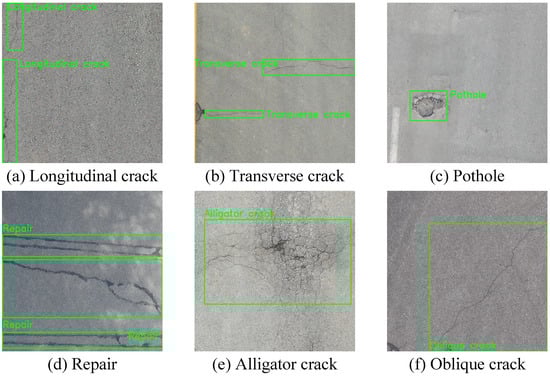 In this paper, the used pavement disease images are captured by an unmanned aerial vehicle (UAV) with a flight altitude of 20.57 m and a flight speed of 5 m/s. As illustrated in Figure 7, the UAV asphalt pavement distress dataset (UAPD) mainly consists of six categories of pavement diseases, including longitudinal crack, transverse crack, pothole, repair, alligator crack and oblique crack. Part of the UAPD is available as open-source data to the community, and a total of 2401 pavement disease images are contained in the dataset downloaded from the website provided in [39]. It includes longitudinal cracks, transverse cracks, alligator cracks, oblique cracks, repairs, and potholes, and the statistics about different types of pavement diseases are listed in Table 1.
