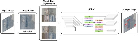 Figure 8 illustrates the proposed methodology. The process starts with the input image, which is resized to a resolution of 640 × 640 pixels. After resizing, mosaic data augmentation is applied to enhance data diversity and model robustness. Finally, the processed image is fed into the model, which predicts the locations and categories of pavement damages. These predictions are visualized in the output image, where the identified damages are highlighted with bounding boxes.