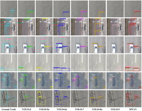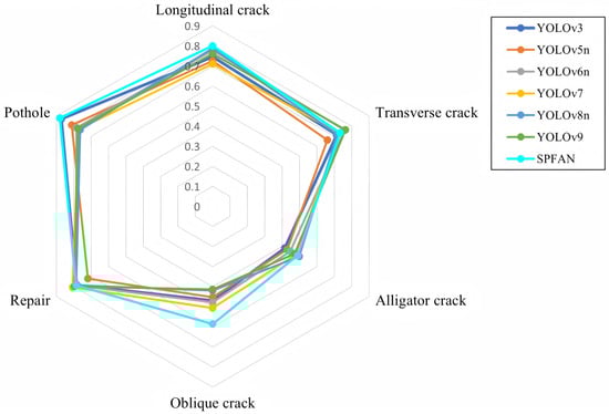 Since the proposed SPFAN generally follows the architecture design of YOLO, it is firstly compared with multiple representative versions of YOLO networks. Figure 9 illustrates the pavement diseases detection performance of different mainstream standard object detection models for the same images. Table 3 display the statistical results of the SPFAN with other object detection models.