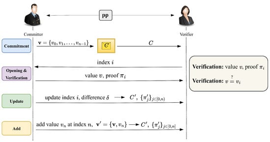 - Catalano, D.; Fiore, D. Vector commitments and their applications. In Proceedings of the Public-Key Cryptography–PKC 2013: 16th International Conference on Practice and Theory in Public-Key Cryptography, Nara, Japan, 26 February–1 March 2013; Proceedings 16. Springer: Berlin/Heidelberg, Germany, 2013; pp. 55–72. [Google Scholar]
