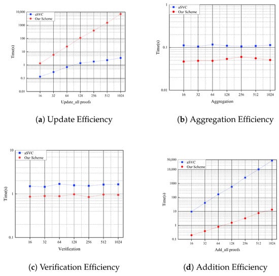 UpdateAllProofs. The experimental results shown in Figure 2a indicate that, in terms of updating all proofs, the aSVC [] approach exhibits superior time efficiency across various vector lengths compared to our proposed scheme. This discrepancy stems from the fact that our scheme directly invokes the OpenAll algorithm, resulting in a higher computational complexity. Therefore, improving the efficiency of proof-updating in our scheme is the aim of our future work.