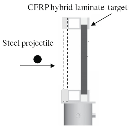 A number of sphere impact tests on woven CFRP plates was carried out at Cranfield Defence and Security Shrivenham [39]. A range of velocities from 179 m/s to 1875 m/s were tested to provide the data for numerical model validation and study the failure mechanisms, specific for composite materials in aerospace applications. Kinetic energy in all considered tests was well above the ballistic limit of the target plates and covers the range of loading conditions where the material undergoes different failure modes, including shock loading. The impact test configuration is shown in Figure 1.