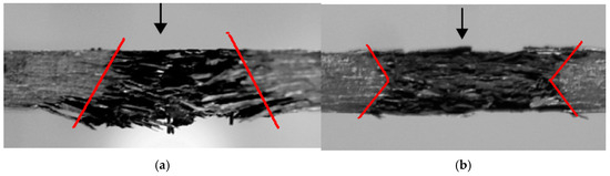 Cross-section of a target CFRP panel after the impact with red lines showing the extent of damage: (a) impact at 305 m/s; shear-dominated failure and conical shape of the crater [39] and (b) impact at 1199 m/s; hourglass shape of the hole [39].