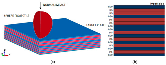 (a) FEM model of a quarter of the sphere impact on woven CFRP composite target—6 mm thick target plate and (b) stack sequence of 6 mm thick woven CFRP composite plate.