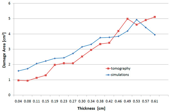 Damage area calculated from simulation results and XCT data for the normal impact at 194 m/s.