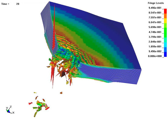 Simulation results for damage distribution in 6 mm thick CFRP after impact at 1199 m/s; t = 20 µs.