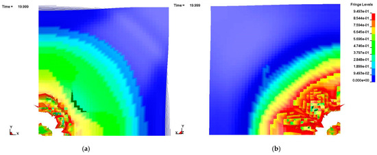 The simulation results for the damage distribution in a 12 mm thick CFRP composite target plate obtained in the impact of a sphere projectile at 1219 m/s at response time t = 35 μs are given in Figure A1, Figure A2 and Figure A3. The simulation results clearly suggest that the damage area is significantly larger than the impactor size on the top and rear surface, whilst it is almost minimum in the midsection of the target plate.