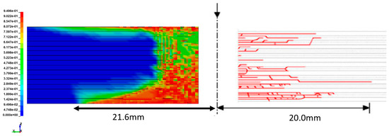 A similar comparison was conducted for the impact at 354 m/s (the shear-dominated failure mode); see Figure 9. The simulations predicted an increasing size of the damaged area through the thickness of the target plate, which suggests a conical shape of the damaged zone in the through thickness cross-section. And the shape agrees well with the experimental data. However, the constitutive model overestimated the magnitude of the damaged area in the top half of the target plate but shows a good agreement in the rear part of the target.