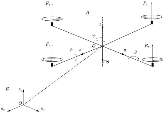 Because the UAV has six degrees of freedom (DOF; three positional degrees of freedom and three attitude angular degrees of freedom) in three dimensions but only four rotor rotational speeds on the input side to adjust the lift, the quadrotor is a typical nonlinear underactuated system. Numerous factors need to be considered when modeling it: thrust, moment, gravity, moment of inertia, counter torque, etc. []. Referring to the model in [,], the dynamics model of a quadrotor UAV can be described as follows: