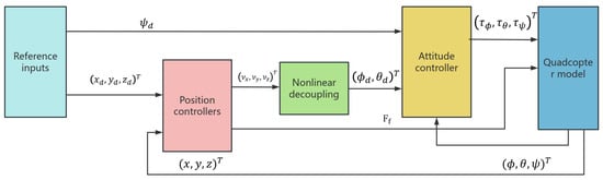 where represent the roll, pitch, and yaw Euler angles, respectively, and , , . The drag coefficient is a positive constant; represent the inertia of the UAV; is the rotational inertia of the propeller; denotes the rotational speed of the propeller; denotes the total thrust in the z-axis; and denote the inputs for the roll angle and the pitch angle, respectively; denotes the yaw moment. , where denotes the thrust generated by the four rotors as a real control input to the powertrain model, b denotes the lift coefficient, and d denotes the force to moment proportionality factor, the exact values of which are shown in Table 1.