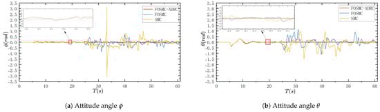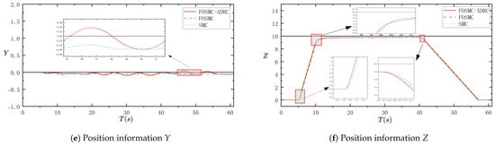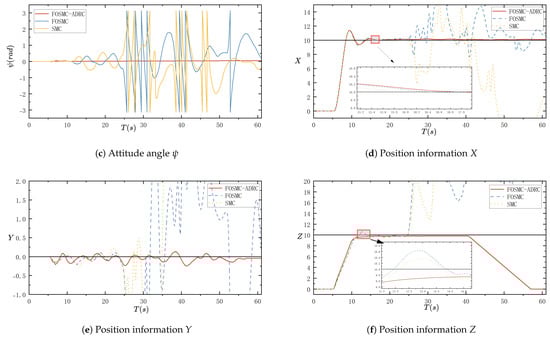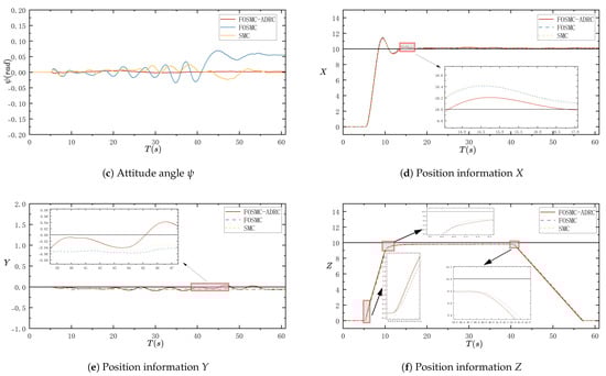 Figure 4a–c show the attitude angles in the resultant graphs, where the proposed controller suppresses the high-frequency switching oscillations of the output of the SMC well, which makes the output smoother and more stable and has a higher control accuracy in the attitude angle . And, the control accuracy is higher in the attitude angle . Figure 4d–f of the total position information show that all three algorithms can track the desired value in a finite time and the tracking effect is better. A more visual comparison can be made by referring to the steady-state error table (Table 4); the controller proposed in this paper has a higher control accuracy, and the response speed in the altitude channel results in a certain degree of improvement compared with the other two kinds of controllers.