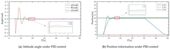 In the case of the same controller parameters, we add the same strong interference signal to the model as before, as shown in Figure 8. The PID controller and the controller proposed in this paper as a comparison can be clearly seen. In the initial moment, the PID controller in the attitude angle control has been dispersed and cannot form an effective control of the quadrotor. In the three graphs of position information, it is obvious that the quadrotor is not under control.