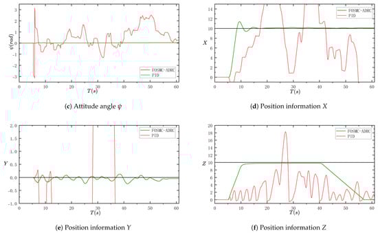 Figure 5a–f show the attitude angle and position information results in the three controllers in the weak interference in the experimental situation, during which they can work normally, and in the absence of interference in the three controllers, the control effect is similar and did not occur in a large change. The next step should be to further increase the interference lightness to observe whether there is a large change in the difference in the control effect of the three controllers.