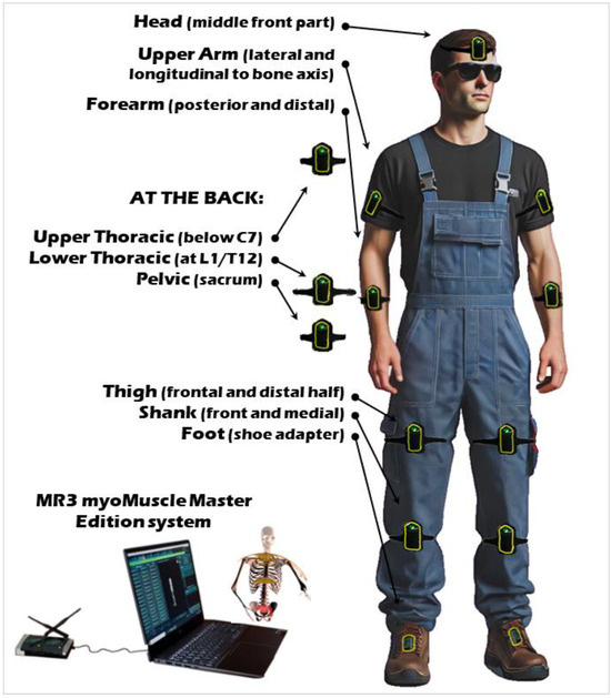 We employed the myoMuscle Master Edition system (myoMOTION™, Noraxon, Scottsdale, AZ, USA) equipped with Master Research 3.0 (MR3) software to record pertinent parameters. This system has 16 inertial motion units (IMUs), utilising inertial sensor technology. The IMUs, incorporating a triad of sensors—a 3D accelerometer, gyroscope, and magnetometer—utilise fusion algorithms to transform sensor data into three-dimensional rotation angles (yaw–pitch–roll or navigation angles) in absolute space. The inertial motion capture system comprising sensors was affixed to the body of the participant (Figure 1), as per the established myoMOTION protocol delineated in the instruction manual. This setup was tasked with recording body accelerations. The scientific validity and high precision of the Inertial Measurement Unit (IMU) system in determining angles have been previously affirmed, exhibiting a maximum error margin of ±0.4 degrees for static assessments and ±1.2 degrees for dynamic evaluations [34,39].