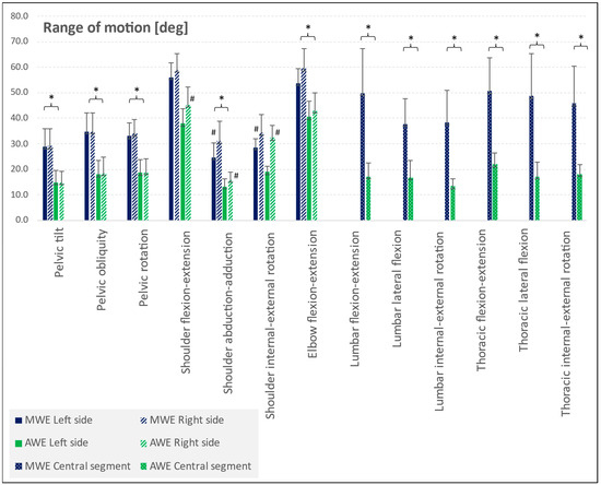 The results of angular displacements (in degrees) for the machining workstation employees (MWEs) and assembly workstation employees (AWEs). The median ± IQR of the range of motion (ROM) in specific joints for the left or right side, as well as the central segment, are presented. The MWE group is represented by blue bars and the AWE group by green bars. Significant differences between MWE and AWE groups are marked with an asterisk (*), based on p-values calculated using the unpaired Mann–Whitney U-test. Differences between the left and right sides within groups are indicated with a hash (#), based on p-values calculated using the dependent samples Wilcoxon signed-rank test.