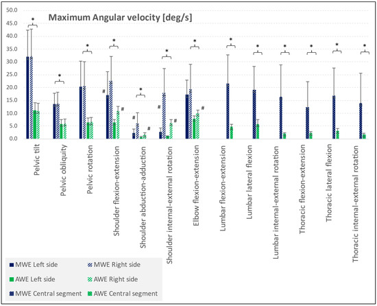 The results of maximum angular velocity (in degrees per second) for the machining workstation employees (MWEs) and assembly workstation employees (AWEs). The median ± IQR of the maximum angular velocity in specific joints for the left or right side, as well as the central segment, are presented. The MWE group is represented by blue bars and the AWE group by green bars. Significant differences between MWE and AWE groups are marked with an asterisk (*), based on p-values calculated using the unpaired Mann–Whitney U-test. Differences between the left and right sides within groups are indicated with a hash (#), based on p-values calculated using the dependent samples Wilcoxon signed-rank test.