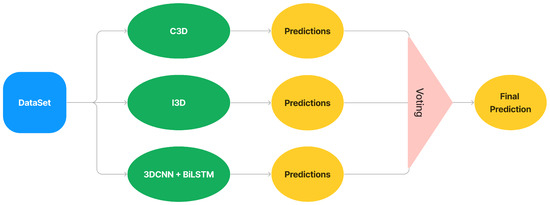 In this study, majority voting was chosen as the ensemble method due to its simplicity and effectiveness in combining the strengths of different models. Majority voting is particularly advantageous when individual models perform well in different areas, as it allows for a more balanced decision-making process by giving equal weight to each model’s prediction. This method helps mitigate the risk of overfitting to any particular model’s biases, as it relies on the consensus of multiple models rather than the dominance of a single one. Additionally, compared to more complex ensemble methods, such as weighted voting or stacking, majority voting is computationally less intensive and easier to implement. Since the performance of the individual models in this study (C3D, I3D, 3DCNN + BiLSTM) is relatively close, giving each model equal importance ensures that the ensemble benefits from their combined strengths without the need for fine-tuning weight parameters, making it an efficient and robust choice for this specific application.