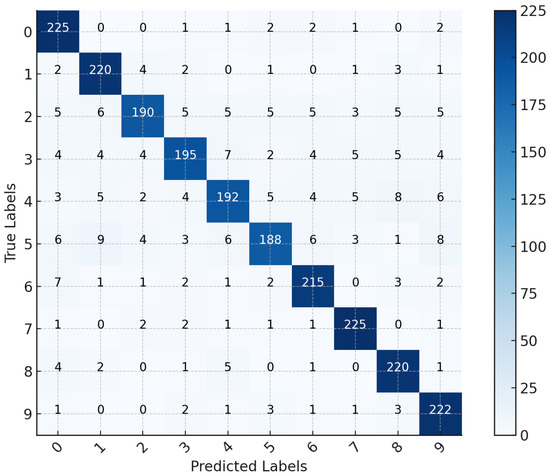 Figure 9 illustrates the ensemble learning model’s performance in classifying the digits 0 through 9. The diagonal elements, representing the correct predictions for each class, are relatively high, indicating strong overall accuracy. Notably, class 0 and class 7 exhibit the highest accuracy, with 225 correctly predicted samples. Class 9 also performs well with 222 correctly classified instances.