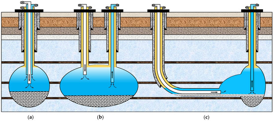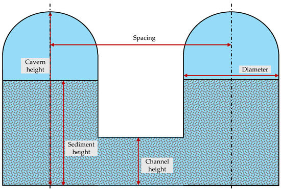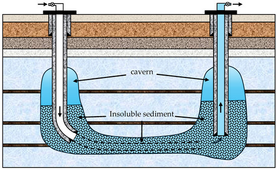 An underground salt cavern is mainly built by injecting fresh water into a drilled well from the ground to dissolve the underground salt rock and form cave with a suitable volume. Affected by geological conditions, the salt-bearing strata in China are characterized by a low salt rock grade, multiple interlayers, and thin salt layers, resulting in a large amount of insoluble residue occupying the bottom of the cavity. Moreover, due to the limit of brine reception concentration, it usually takes 4–8 years to build a salt cavern with the conventional single-well construction technology, which seriously hinders the construction of large-scale salt cavern underground storage (SCUG). With the increasing complexity of geological conditions and the growth of storage facilities demand, various cavity construction methods such as two-well cavern construction with small spacing and a horizontal well salt cavern have been proposed [26,27,28,29] (as in Figure 1), but they still have technical bottlenecks [30]. How to efficiently and quickly construct underground salt cavern storage has become a major challenge at present. In this situation, the old cavities left by salt mining companies have attracted people’s attention. China has a long history of salt production, and a large number of old salt cavities have been left behind, most of which are butted well salt caverns (BWSC) [31,32] (as in Figure 2). According to statistics, the space volume of old salt cavities in Jiangsu and Henan provinces in China has reached more than 200 million cubic meters, and it is still growing at a rate of 20 million cubic meters per year. If these old cavities are fully utilized to transformed into underground storage facilities, this can not only eliminate potential risks, but also save a lot of time in cavern construction and quickly form large-scale underground storage capacity [33].