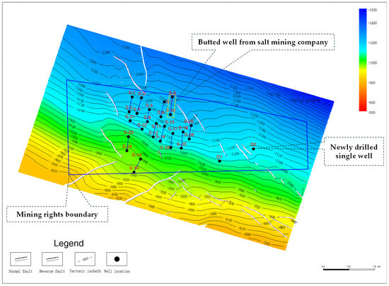 The Yexian salt mine is in Pingdingshan City, Henan Province, China. Geologically, it is located in the Wuyang sag. The sag is a narrow and long faulted Salt Lake basin with an area of approximately 1800 km2. From the Cretaceous to the Quaternary, the Hugang Formation (K2h), Yuhuangding Formation (E2y), Dacangfang Formation (E2d), Hetaoyuan Formation (E2h), Liaozhuang Formation (E3l), Shangsi Formation (Nsh), and Pingyuan Formation (Qp) were deposited successively. The salt-bearing strata are the Hetaoyuan Formation of the Paleogene Oligocene. After years of exploration and research, it has been determined that the sag presents a salt bearing area of 400 km2 and a salt resource of 236.3 billion tons, belonging to a super-large salt rock deposit. There are 21 salt groups developed from top to bottom in the deposit, with a salt layer thickness range of 120–550 m and a top burial depth range of 700–1200 m. Since 1988, six salt production companies have successively mined and produced salt in this area, and more than 80 production wells have been formed so far. In 2020, the Huabei Oilfield Company planned to build an underground salt cavern gas storage in this region and reached a co-operation intention with the Pingmei United Salt Mine Company, intending to construct the facility through a combination of new cavity construction and old cavity transformation. The Pingmei Company’s old cavities are mainly produced by a directional butted well with interactive injection–production mode. Since the mining operations began in 2008, a total of approximately 59 million cubic meters of brine have been extracted, which is estimated to form about 6 million cubic meters of effective underground space. Among these mining wells, 13 pairs of old wells have been selected for storage facility renovation, as in Figure 3. In addition, a total of 14.28 km2 of 3D seismic data acquisition, processing, and interpretation, as well as the drilling of two data wells (D1, D2), the cleaning of six old wells, and the sonar inspection of old cavities (as shown in Figure 4), have been successively completed, providing fundamental data for this study.