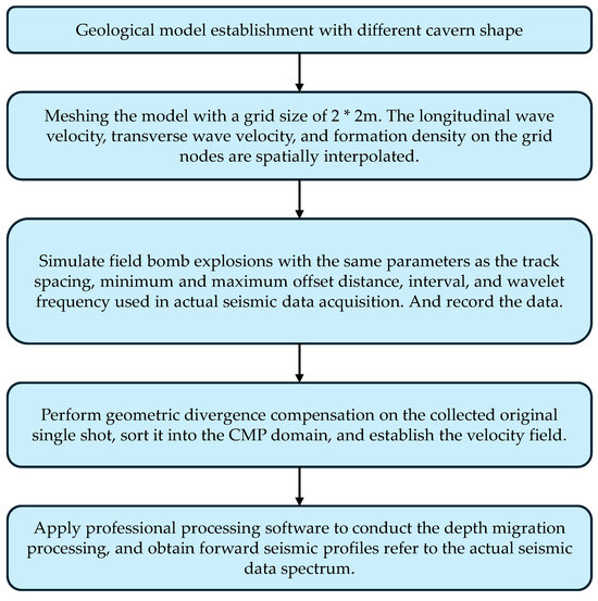 In the forward simulation of seismic wave fields, various random medium models and seismic sources were established. The elastic wave equation, derived under inhomogeneous medium conditions, was solved using the finite difference method, taking into account the initial conditions and absorption boundary conditions. This allowed us to obtain theoretical synthetic seismic wave field records for different geological models, which can be used for wave field feature analysis. The wave equation forward simulation process is shown in Figure 5.