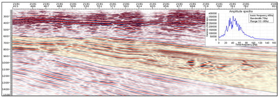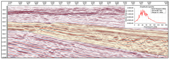 Through the interpretation and analysis of the 14.28 km2 three-dimensional seismic data from the Yexian Salt Mine area, it has been found that the spectral characteristics of the processed seismic data are essentially in agreement with those of the pure wave seismic data. The dominant frequency of the target layer is 45 Hz, with a frequency band ranging from 10 to 80 Hz and a bandwidth of 70 Hz, as shown in Figure 6 and Figure 7. These findings provide fundamental parameters for the subsequent forward simulation.