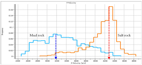Histogram analysis of lithological velocity. The blue dashed arrow refers to the preferred velocity value of mud rock lithology. The red dashed arrow refers to the preferred velocity value of salt rock lithology.