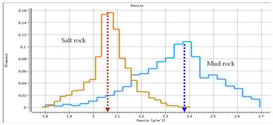 Histogram analysis of lithological density. The blue dashed arrow refers to the preferred density value of mud rock lithology. The red dashed arrow refers to the preferred density value of salt rock lithology.