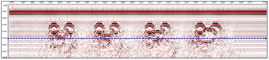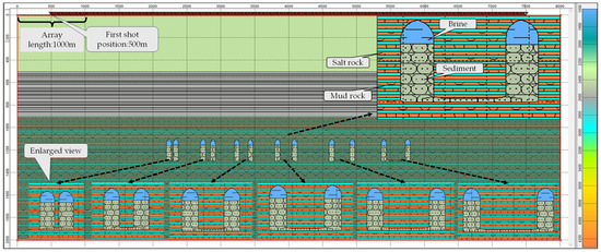 Based on the actual 3D seismic acquisition parameters of the Yexian salt mine area, a study observation model was designed, as shown in Figure 11. The model has a length of 8000 m and a depth of 2000 m. It employs the method of middle blasting with two-sided reception, where the detection point moves along with the blasting points. The track spacing is set at 20 m, with an array length of 1000 m and a blasting spacing of 20 m. The blasting commences at 500 m and concludes at 7500 m, totaling 351 blasts. For the seismic wavelets’ polarity and spectrum, a positive polarity Rayleigh wave with a main frequency of 45 Hz is selected.