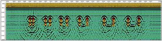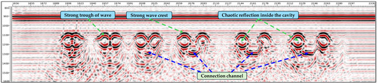 Figure 22 displays the seismic record profile of variable density at different horizontal channel heights. As shown in the figure, the seismic reflection characteristics of the cavity remain unaffected by the increase in horizontal channel height. The top surface of the cavity still exhibits the distinctive pattern of “two peaks sandwiching a strong valley”. The position of the reflection waveform on the residue’s top surface inside the cavity correlates with the channel height. Additionally, the single cavity’s “ring-shaped” feature is prominent and remains constant irrespective of the channel height. And the entire BWSC model exhibits an eyeglasses-like waveform. As the proportion of channel height relative to the cavity height increases (up to 25%), the top and bottom surfaces of the horizontal channel become progressively more distinguishable. In addition, as the channel height increases, the top surface of the channel also exhibits a characteristic of “two peaks sandwiching a strong valley”, similar to the cavity roof reflection.