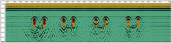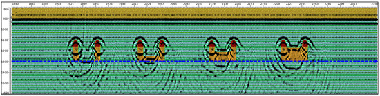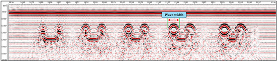 Figure 19 shows the seismic record profile of variable density with different residual height. Notably, the reflection feature of the cavity’s top surface remains consistent, featuring a strong wave trough that is unaffected by the sediment height. The entire cavity presents a “ring-shaped” reflection pattern, with scattered, weak reflections within its confines. As the residue height increases, the lower boundary of this “ring-shaped” waveform shifts gradually upward. When the residue height in the cavity reaches 90% of the cavity’s total height, the lower boundary of the circular reflection wave vanishes.