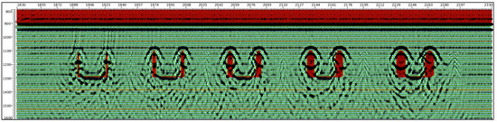 Congruent diagrams of waveform seismic record profiles and cavity models with different cavity spacing.