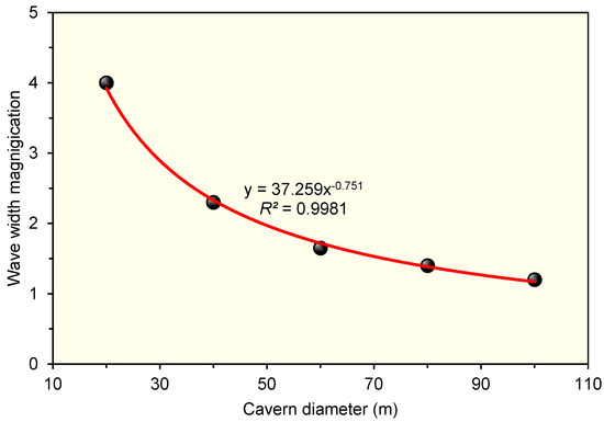 Figure 15 presents a superposition diagram of waveform and salt cavern models with different cavern diameters. The diagram distinctly highlights the prominent trough features on the top surface of the cavity, which remain consistent in their relative position irrespective of the cavity diameter. As the cavern diameter increases, the wave width depicted by the waveform expands accordingly, demonstrating an amplification effect. Notably, a smaller cavern diameter results in a larger magnification factor, whereas a larger cavern diameter causes the seismic waveform width to more closely align with the model width. This inverse relationship between the magnification factor and the salt cavity diameter is further illustrated in Figure 16. Such phenomena have also been documented in literatures [46,47]. Additionally, the top surface of the insoluble residue within the cavity exhibits a downward deviation pattern. The seismic reflection characteristics of the horizontal channel are relatively distinct, with its bottom surface corresponding to the peak reflection features, and their relative position remains largely unaffected by changes in the cavity diameter.