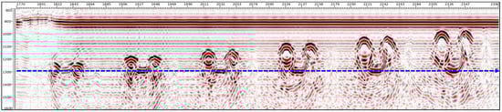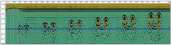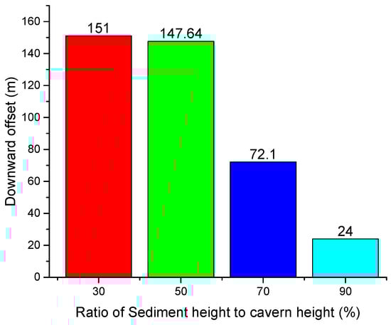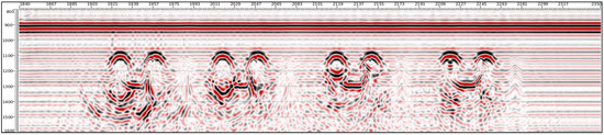 Figure 17 shows the seismic record profiles of variable density at different cavity heights. Obviously, the top surface of an 80-m-diameter cavity is clearly visible across various cavity heights. This top surface consistently exhibits a prominent valley reflection feature, while the interior of the cavity and the sediment bottom appear blurred. The entire cavity presents a circular pattern. As the cavity height increases, the reflection energy at the lower portion of the circular wave reflection diminishes, leading to a more blurred appearance. Importantly, the reflection characteristics of the horizontal channel remain unaffected by cavity height, consistently demonstrating a strong amplitude reflection pattern characterized by “one valley and one peak”.