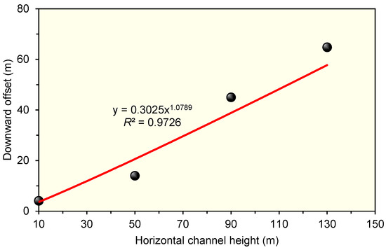 Relationship between horizontal channel height and seismic reflection offset at the bottom of the channel.