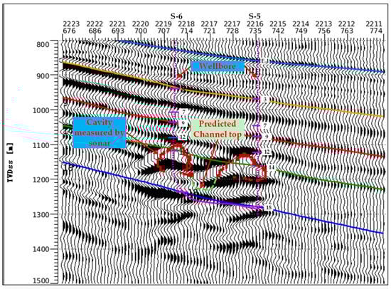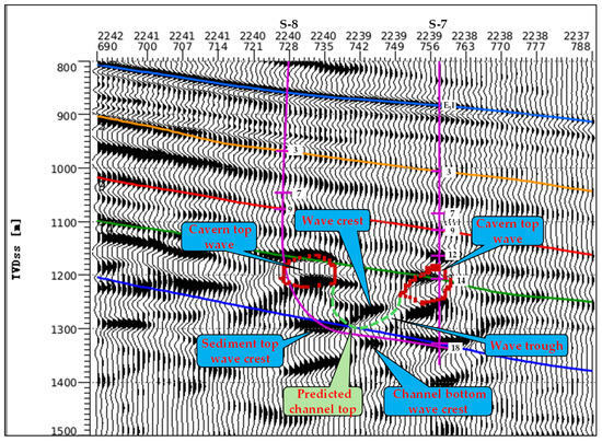 S-5/6 and S-7/8 wells are two pairs of butted well old cavities in Yexian salt mine, Henan Province, China, that have undergone sonar cavity measurement work. The sonar results reveal significant differences in shape and height between the cavities in each pair, despite the small spacing (50 m from S-5/6) between them. High-precision time-deep conversion verification of the seismic profile shows that the “two peaks sandwiching a strong valley “feature on the cavity top surface, observed in forward simulation results, remains prominent. The position of the strong wave valley aligns well with the cavity roof. However, the reflection characteristics of the residual top surface within the cavity and the connecting channel are more complex than those in seismic forward simulation, but the downward offset phenomenon of the residual top surface is really present in actual seismic reflection, as shown in Figure 25. In addition, the seismic waveform of S-7/8 reveals other reflection wave disturbance phenomena in the peak and trough characteristics of the horizontal connection channel. The channel connected to S-7 exhibits an inclined “one peak and one valley” feature, with a partial “one valley, one peak” feature in the middle (as Figure 26), reflecting the reflection law of the connected channel in forward simulation. Considering the cavity morphology and wellbore trajectory, the top surface contour of some connection channels can be roughly outlined, indicating small horizontal channel height. Overall, while forward simulation cannot fully capture the three-dimensional morphology of the butted well old cavities, it provides valuable information for identifying the true shapes by adopting three-dimensional seismic method.
