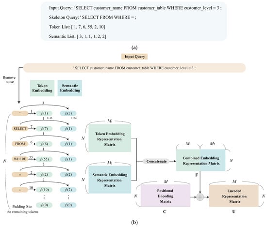 An example of the results produced by the proposed embedding scheme. (a) Based on an input query, a skeleton query is first formed by removing user-defined identifiers and attributes. Lists of N tokens and their corresponding semantic labels are then created from the skeleton query. (b) From the lists of tokens and labels, the combined embedding representation matrix  is then produced, which contains numerical vectors representing the tokens and the semantic labels. The position information of tokens, denoted by , is then added to . The results are termed the encoded representation matrix, denoted by .