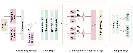 Proposed model for detection operations, which consists of three stages: CNN, self-attention, and output stages. The detection section takes the encoded representation matrix  as the input. It then produces z, the estimated probability of malicious attack by the input query. When , the query is malicious.