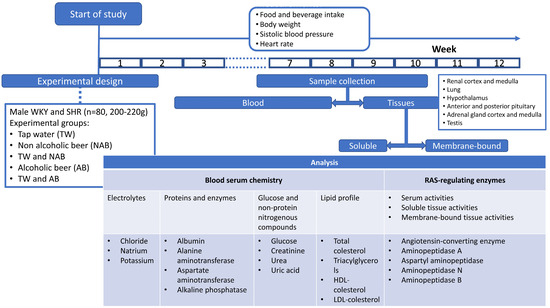 Thus, beer consumption has been proposed as a dietary factor capable of reducing the incidence of cardiovascular diseases and hypertension [30,31,32,33,34,35,36,37,38,39,44,45,46]. However, the mechanisms underlying this effect remain unknown. Therefore, the use and/or recommendation of beer in a diet must be based on a thorough understanding of both its benefits and risks [47]. Here, we analyze the effect of the consumption of alcoholic beer (AB) and non-alcoholic beer (NAB) on heart rate, blood pressure, serum biochemistry (electrolytes, glucose and non-protein nitrogenous compounds, protein and enzymes and lipid profile) and the activity of RAS-regulating proteolytic enzymes in serum and the tissues involved in blood pressure regulation in healthy Wistar–Kyoto rats (WKY) and spontaneous hypertensive rats (SHRs). As more studies suggest that beer consumption positively influences cardiovascular health, it is crucial to understand the biochemical mechanisms by which these beneficial effects are exerted. Therefore, we hypothesize that beer consumption, both alcoholic and non-alcoholic, influences blood pressure regulation through the modulation of the activity of enzymes that regulate the RAS, as well as affecting other metabolic and functional parameters. This study will provide valuable information regarding the ability of AB and NAB to influence blood pressure regulation.
