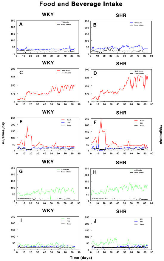 Figure 2 shows the food and beverage intake in both WKY and SHRs over the period of study. In WKY (Figure 2A), both food and water intake remained relatively stable throughout the study, with minor fluctuations. In contrast, SHRs (Figure 2B) exhibited a slightly more variable pattern of TW and food intake, but with no major deviations. Figure 2C,D illustrate the intake of non-alcoholic beer (NAB) and food in WKY and SHRs. In WKY, NAB intake increased after day 26, while food intake slightly fluctuated but remained consistent. SHRs also showed a pronounced increase in NAB intake after day 26, with a sharp rise after day 50, accompanied by noticeable fluctuations in food intake. Figure 2E,F combine the intake of both TW and NAB, along with food consumption. In WKY, both TW and NAB remained relatively stable, with major increases in NAB intake after day 21 to decreases after day 20, while food intake was largely steady. In SHRs, NAB intake showed a sharp increase after day 21 to return to lower values after day 20, while TW intake stayed relatively low; food consumption showed minor fluctuations. Figure 2G,H depict alcohol-containing beer (AB) and food intake in WKY and SHRs. In WKY, AB intake slightly increased with fluctuations over time, with food intake remaining relatively stable. SHRs also demonstrated a pronounced fluctuation in AB intake, particularly after day 40, and food consumption varied slightly throughout the study. Finally, Figure 2I,J combine AB and TW intake with food consumption. In WKY, both AB and TW intake remained stable, with minimal changes, while food intake was constant. In SHRs, a similar trend of steady TW intake with slight AB fluctuations was observed, and food intake remained consistent throughout the 100-day period.