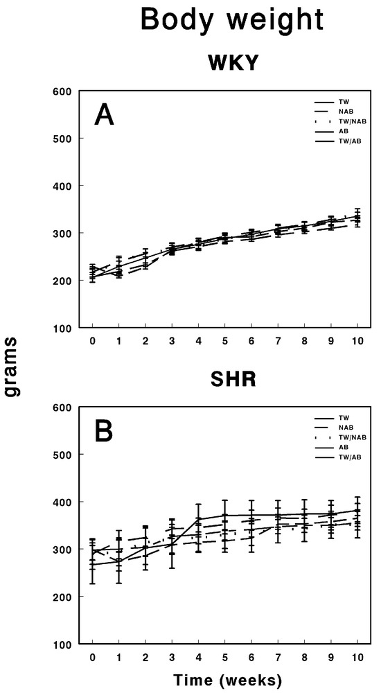 Body weight of (A) Wistar–Kyoto rats (WKY) and (B) spontaneously hypertensive rats (SHRs). Experimental groups included animals provided with tap water (TW), alcohol-free beer (NAB), tap water or alcohol-free beer at their discretion (TW/NAB), alcoholic beer (AB), or tap water and alcoholic beer at their discretion (TW/AB). Results are expressed in grams as mean body weight ± SEM (n = 8).