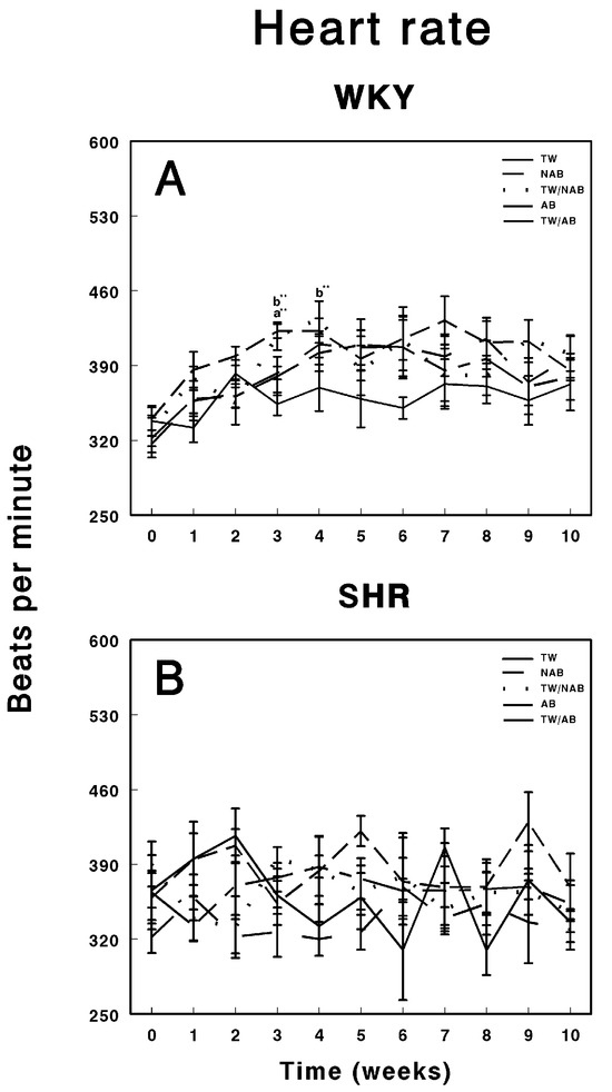 Heart rate measurements in (A) Wistar–Kyoto rats (WKY) and (B) spontaneously hypertensive rats (SHRs). Experimental groups included animals provided with tap water (TW), alcohol-free beer (NAB), tap water or alcohol-free beer at their discretion (TW/NAB), alcoholic beer (AB), or tap water and alcoholic beer at their discretion (TW/AB). Results are presented in beats per minute ± SEM (n = 8; ** p < 0.01).