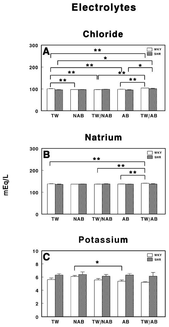 Serum electrolyte levels in Wistar–Kyoto rats (WKY) and spontaneously hypertensive rats (SHR): (A) chloride (Cl−), (B) sodium (Na+), and (C) potassium (K+). Experimental groups included animals provided with tap water (TW), alcohol-free beer (NAB), tap water or alcohol-free beer at their discretion (TW/NAB), alcoholic beer (AB), or tap water and alcoholic beer at their discretion (TW/AB). Results are expressed in milliequivalents per liter (mEq/L) as mean ± SEM (n = 8; * p < 0.05; ** p < 0.01).